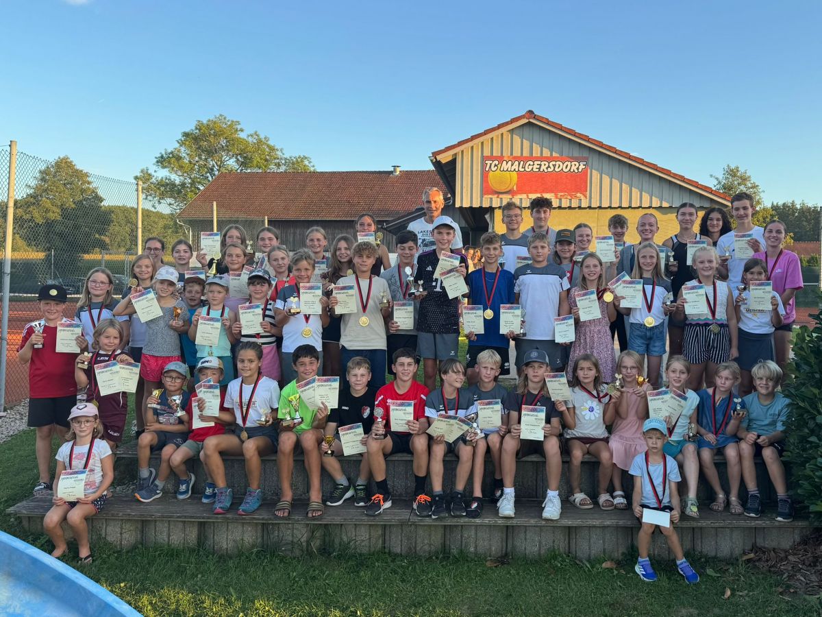 Der Tennisclub Malgersdorf hat auch heuer sehr erfolgreich und mit einer überragenden Beteiligung von 64 Kindern die Jugendmeisterschaften durchgeführt. Bereits in den letzten Ferienwochen wurde ausgelost, und die letzten schulfreien Tage konnten noch ausgenutzt werden, um in den sage und schreibe 15 Kategorien die Sieger zu ermitteln. Die Eltern konnten viele spannende Matches beobachten und auch gleich ein bisschen „trösten“, wenn es am Ende doch nicht zum Sieg gereicht hat. Die Kleinsten, die sog. „Zamperl“, die heuer das erste Mal am Training teilgenommen haben, waren am Finaltag gefordert, um sich bei verschiedenen Geschicklichkeits-Aufgaben rund um den Tennisball zu beweisen. Hier konnte sich Theo März vor Linus Steiger und Ella Spielbauer den Siegerpokal sichern.